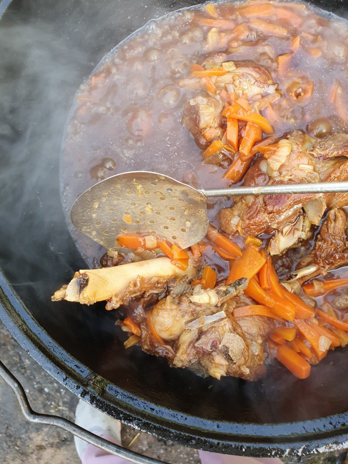 закрываем кипящий казан крышкой и разбираем костер. оставляем его с закрытой крышкой на 20-30 минут, периодически поглядывая, чтобы угли совсем не потухли