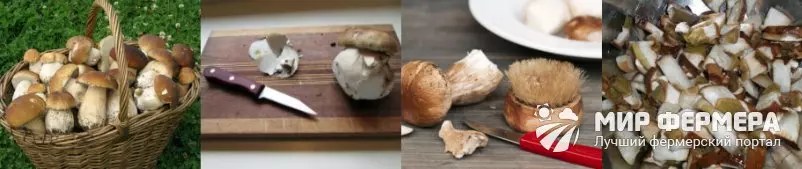 Перед тепловой обработкой грибочки нужно, как следует, подготовить. Свежие белые грибочки очищают, удаляя тщательно темные пятнышки.