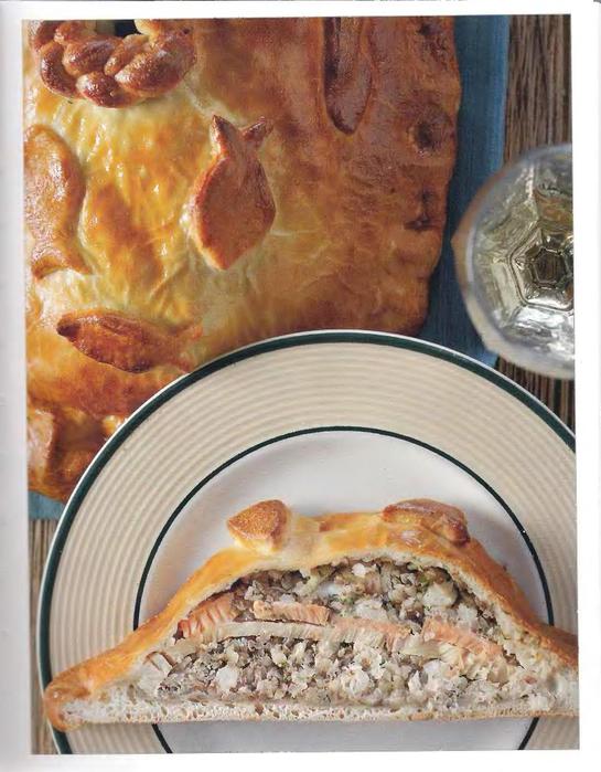 11. Выпекайте кулебяку от 50 до 60 минут, пока тесто не станет золотисто-коричневым.Примерно в середине приготовления переверните сковороду, чтобы обеспечить равномерное подрумянивание. Дайте кулебяке остыть на сковороде в течение нескольких минут, затем осторожно переложите его на большое сервировочное блюдо. Подавать горячим или теплым, разрезав зазубренным ножом крест-накрест на ломтики толщиной 1 1/2 дюйма.