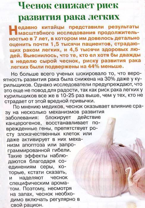 Исследования показали, что чеснок является средством, которое оказывает профилактическое действие против возникновения раковых заболеваний. А всё благодаря аллицину, соединению, которое содержит растение. Именно оно и придаёт чесноку известный специфический запах. Само по себе вещество не усваивается нашим организмом и легко выводится им, в том числе, с дыханием. И вот, проходя дыхательные пути, аллицин предотвращает риск инфекционных процессов, а также возникновения рака легких. Кроме того он обладает выраженными антиоксидантными свойствами, защищая клетки нашего организма от воздействия свободных радикалов. Также в нем содержится много кальция, калия, фосфора, цинка, меди, селена, фолатов, витаминов В6, С и К.
