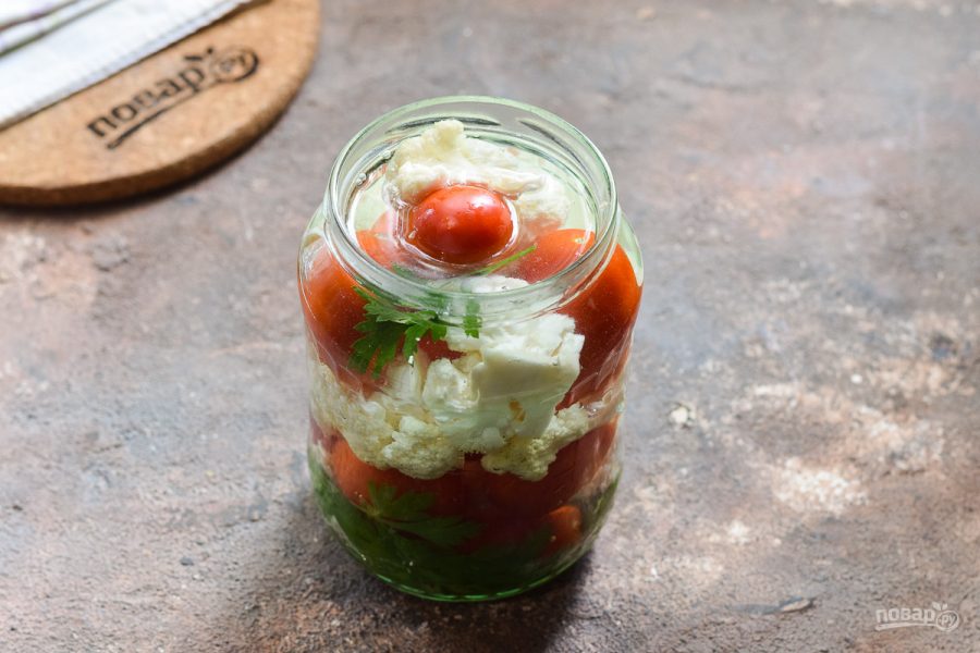 - 7Выкладываем на сковороду с томатной смесью соцветья цветной капусты. Тушим всё под крышкой в течение 15 минут.