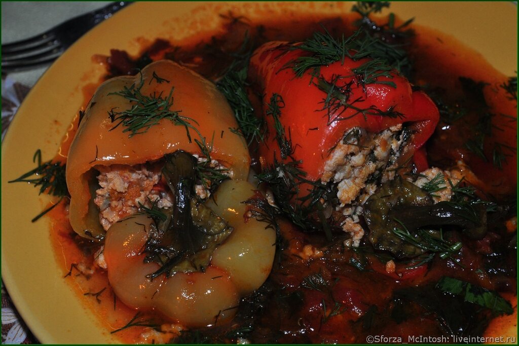 Начинку перцев часто делаю с рисом и овощами…..А вот на подливке отрываюсь……Иногда делаю сметанную,иногда (для цвета) добавляю немного кетчупа……..Такие перцы у нас не блюдо,а гарнир к мясу,курице……Просто диетическое ( без сметаны).