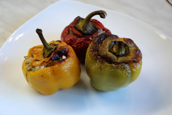 Это достойный, но очень простой рецепт.Вот мои мысли. Во-первых, не срезайте верхушку перца, он тратит слишком много перца, разрежьте его пополам вдоль. Начинка из говядины и риса достаточно пресная.