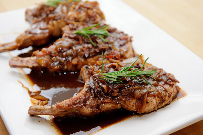 Для создания золотистой корочки разогреваем сковороду с растительным маслом (до дымка) и обжариваем по три минуты с каждой стороны. Не выкладывайте сразу все кусочки — если жарить по одному, корочка образуется намного лучше. Теперь выложите мясо в форму для запекания и отправляйте в духовку на 15 минут при 160 градусах. Корейка свиная без кости по этому рецепту получается также безупречной.