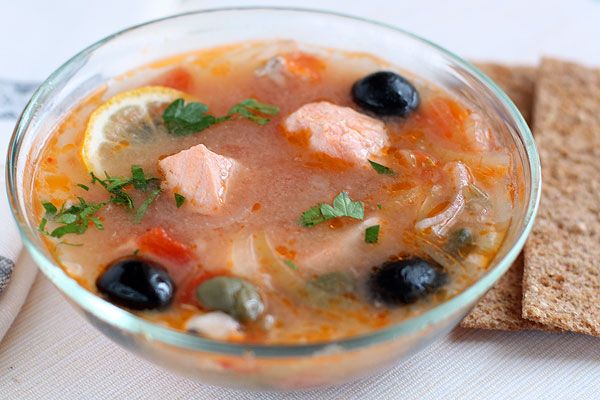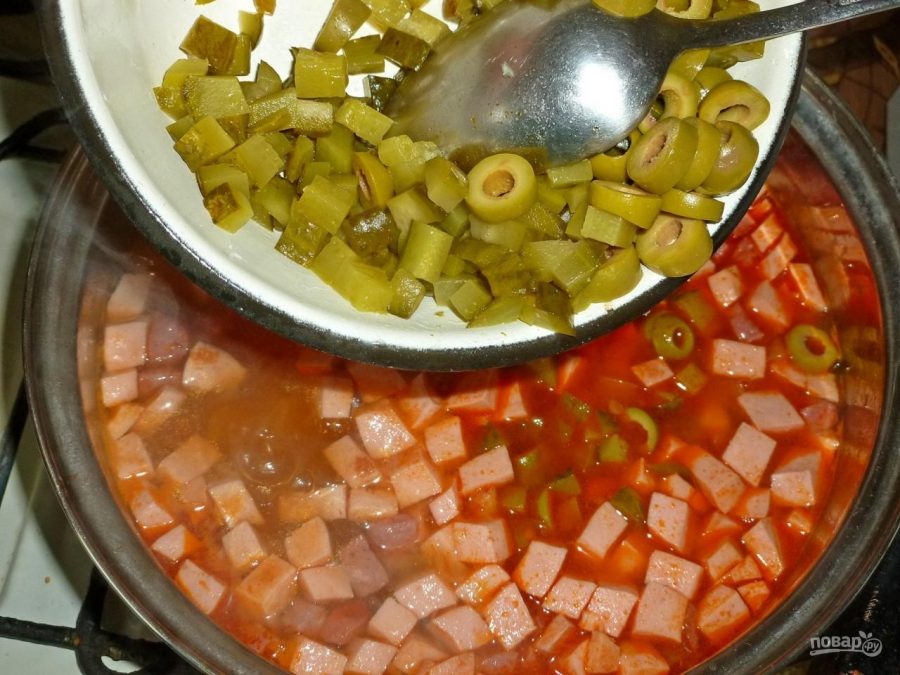 Кстати, вкус солянки станет богаче при добавлении небольшого количества маринада из оливок или каперсов.