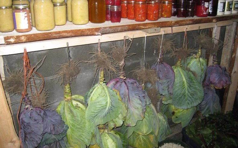 Самый простой способ. Он заключается в том, что капусту подвешивают в погребе за стебли.