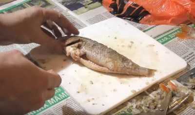 - Последним действием надрезаете брюхо и вытаскиваете потроха. У замороженной рыбы делается это очень легко.
