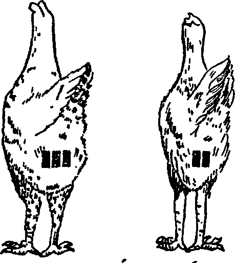 Очень удобно и просто отмечать кур, отрезая у них коготки на пальцах. Если обрезать на разных пальцах и на разных ногах, то можно пометить очень много кур. Для отметки снесшихся можно описать каждую курицу, отмечая крестиками целые коготки, а черточками — срезанные. На рисунке 1 и 2 видно, что можно пометить 36 кур, причем у некоторых кур будет больше коготков, а у некоторых меньше, но всегда останутся целыми три коготка, чтобы удобнее было курице в земле копаться.