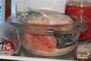 - Натирают полученной смесью рыбный кусок, оборачивают белой хлопчатобумажной тканью, помещают в эмалированный лоток или стеклянную емкость.