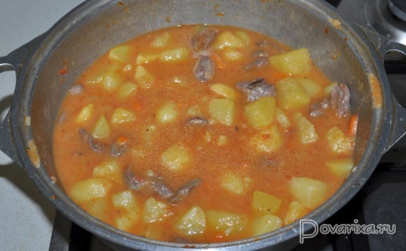 9. Полученный соус влить в картошку с куриными желудками. Тушить до готовности картофеля (будет легко прокалываться вилкой или ножом), периодически открывая крышку и перемешивая.