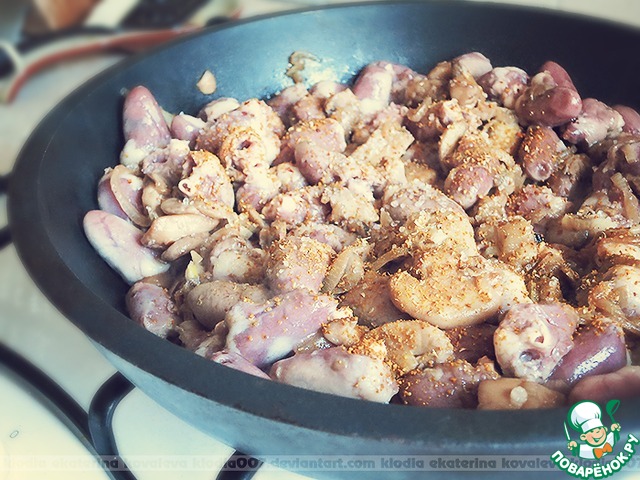 Добавьте обработанные сердечки в сковороду с жарящимся луком.