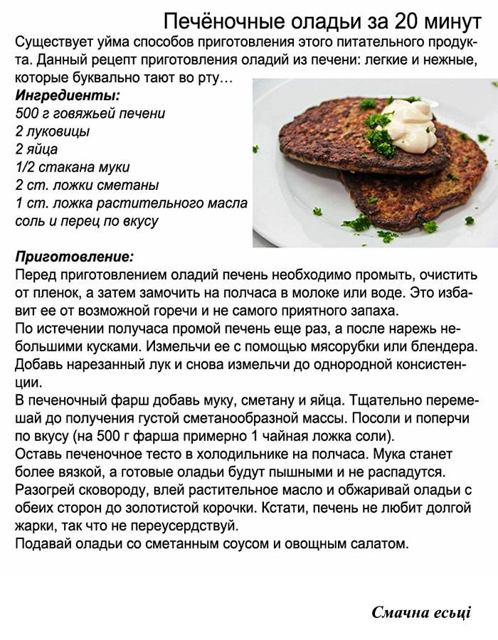 Приготовление: Приготовь в блендере тесто из печени, лука, яйца и муки, добавь специи. Наливай оладьи ложкой и обжаривай буквально по минуте с каждой стороны.