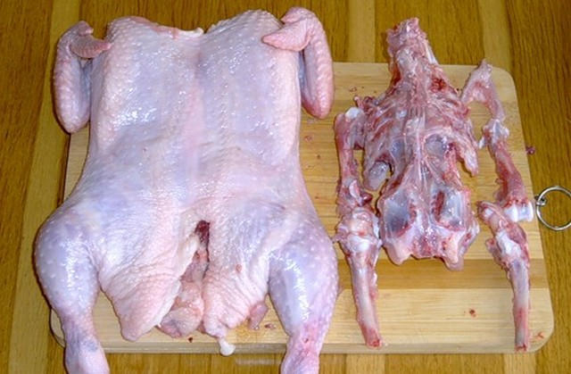 - Спинку можно разделить пополам под ребрами, а можно оставить нетронутой. Эта часть обычно используется для бульона.
