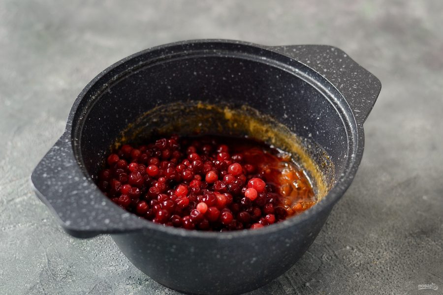 1. Бруснику перебрать, промыть, залить кипятком на 2-3 минуты, чтобы убрать горечь. Слейте воду.