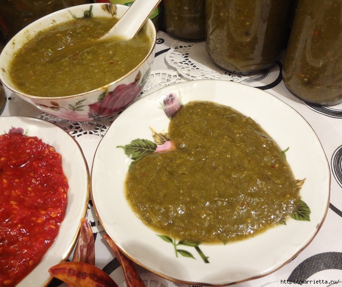 Зелень мелко нарезать ножом, чеснок можно пропустить через пресс или тоже мелко нарезать, красный перец нарезать на маленькие кусочки (работайте с перцем в перчатках, чтобы уберечь себя от его остроты).