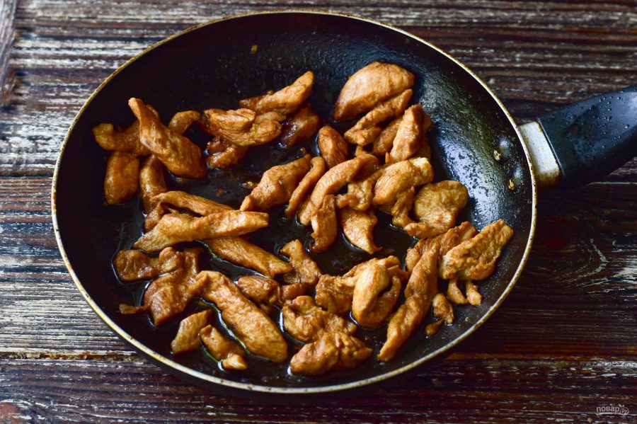 Куриную грудку прежде всего очистите от кожи и костей, затем промойте и нарежьте тонкими кусочками, лучше, полосочками.