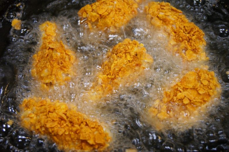В узкий сотейник влить растительное масло — наполняйте примерно на 1/3 (или немного больше), чтобы кусочки свободно плавали в масле при жарке. Масло разогреть до температуры 160 градусов.