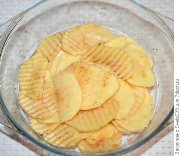 Подготовьте картофель. Нарежьте ножом картофель на тонкие пластины толщиной до 2 мм. Залейте слайсы водой и промойте, чтобы избавиться от крахмала. Излишки влаги уберите бумажным полотенцем. Выложите картофельные кружки в один слой на доску и посыпьте солью и смесью специй.