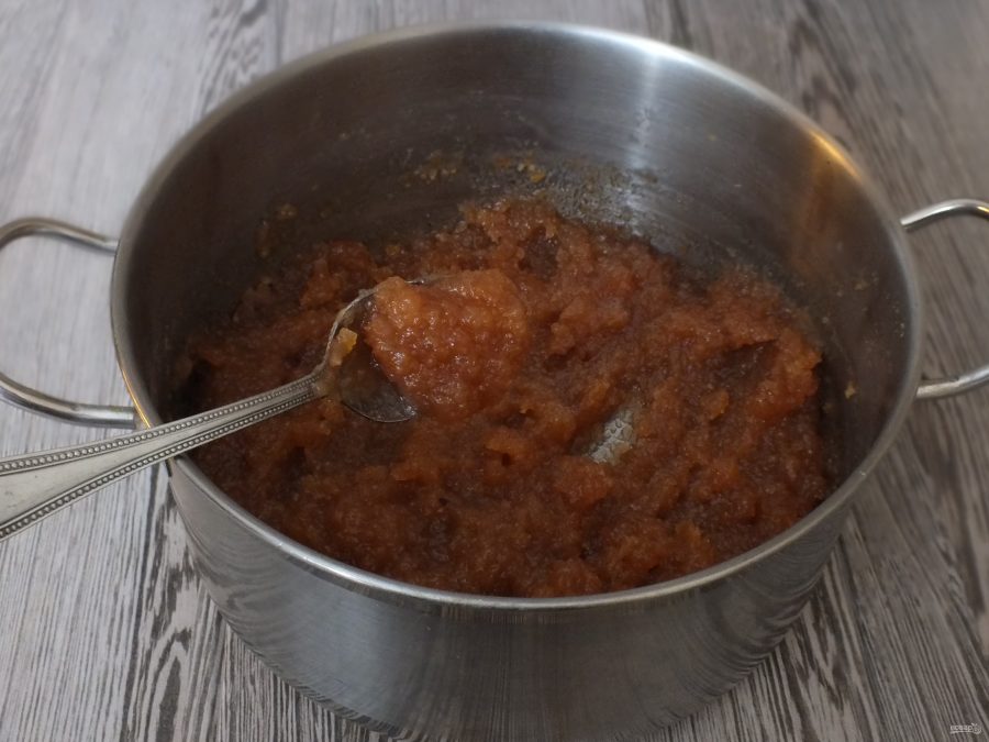 Для определения необходимого количества сахара и специй, измеряем объем полученного пюре. На каждый литр пюре понадобится 0.5 килограмма сахара, сок и цедра 1 лимона, 100 мл яблочного уксуса, 1 ч.