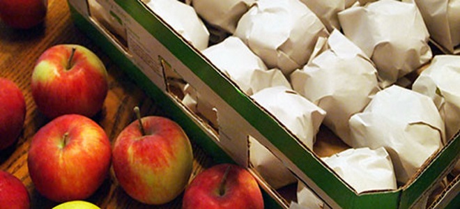 - Ящики. Тара выстилается полиэтиленом, в нее закладываются яблоки, каждый слой прокладывается бумагой или опилками. Сверху масса опять покрывается полиэтиленом. Если текстура материала плотная, коробки можно ставить друг на друга.