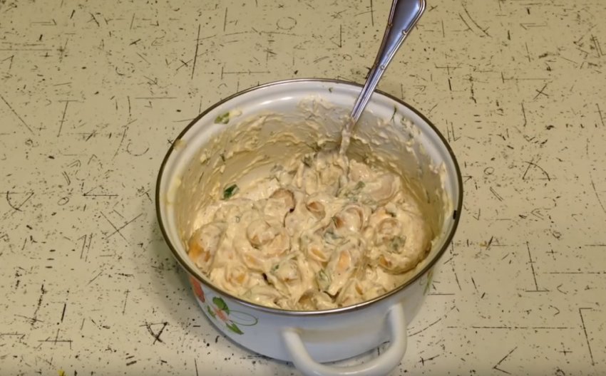 - Добавьте майонез, поставьте кастрюлю в холодильник минимум на 4 часа (идеальный вариант — заготовка с вечера).