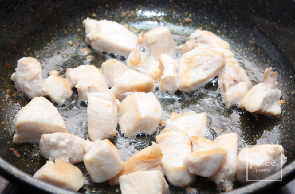 1. Перво–наперво разрезаем мясо на небольшие кубики. Если вы хотите чистые диетические кусочки, кожицу можно снять. Если вы любитель кожи, то, конечно, оставляйте.