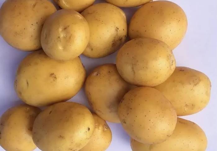 Клубни ровные, овальные, одинаковой величины и плотной структуры. Кожица гладкая, желтая. На поверхности в небольшом количестве расположены мелкие глазки.