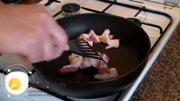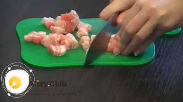 Бекон нарезается произвольно – или соломкой, или небольшими слайсами.