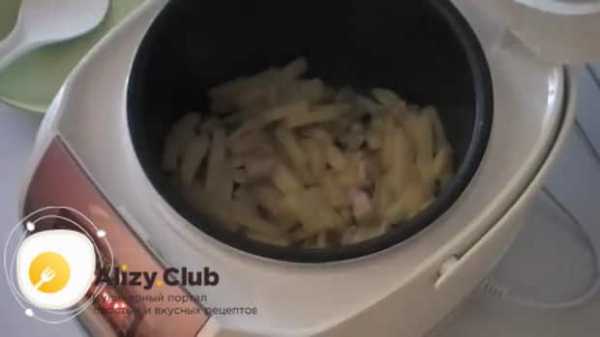 - Через 8 минут посолить, поперчить и добавить мускатный орех в картофель. Закрыть крышку и готовить оставшееся время.