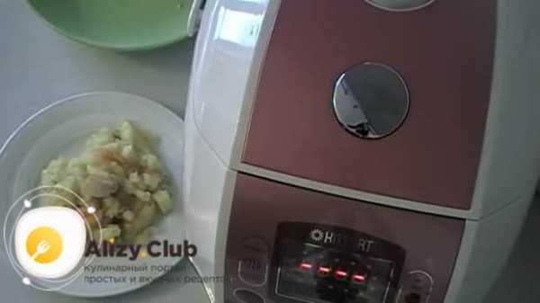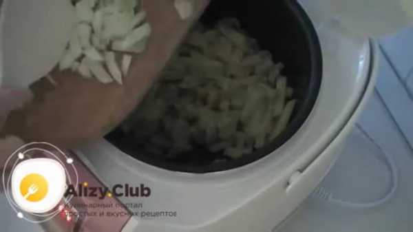 - Очистить и помыть одну луковицу. Нарезать ее полукольцами и отправить к картофелю за 15 минут до окончания режима, т. е. на 35 минуте готовки.