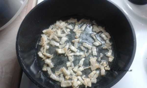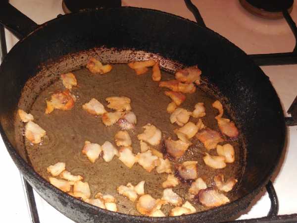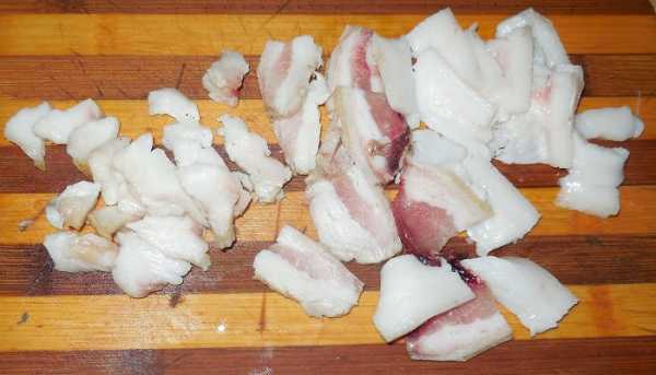 Сало необходимо нарезать небольшими кусочками, выложить на сковороду и обжарить до появления слабой корочки.