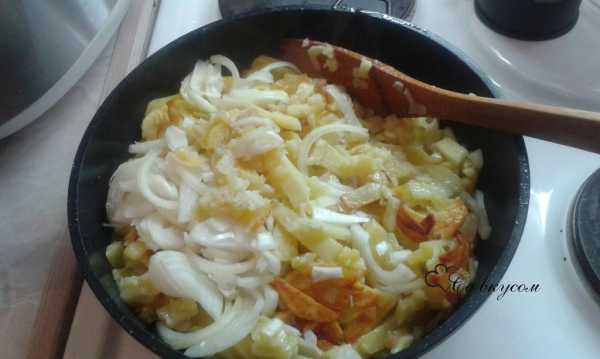 - Очистить одну луковицу, нарезать полукольцами, отправить к картофелю и готовить еще 5-7 минут.