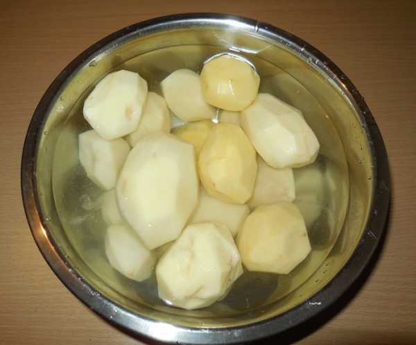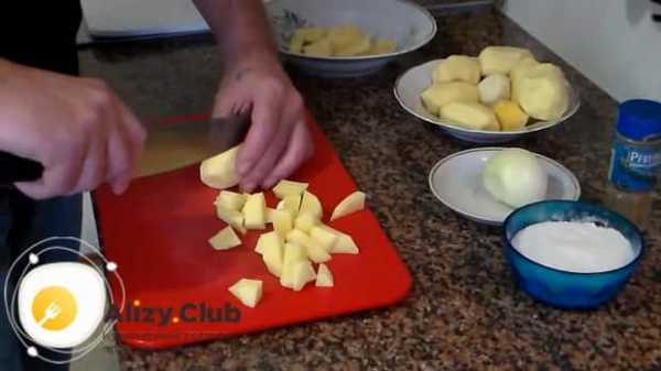 Для начала, необходимо очистить весь картофель и при необходимости вырезать пораженные места и черные точки. Очищенную картошку, что бы она не потемнела, следует держать в воде. Затем, картошку следует хорошенько сполоснуть под проточной водой и можно приступить к нарезке.