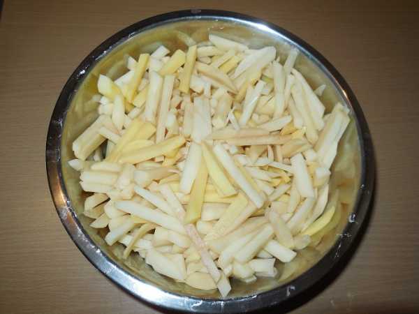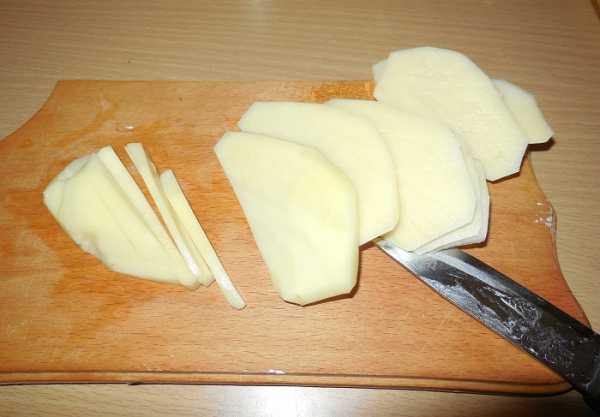 Почистим и нарежем картофель на продолговатые бруски поперечным сечением немного менее 1 см. Ни в коем случае нельзя солить нарезанный картофель. Блюдо будет испорчено.