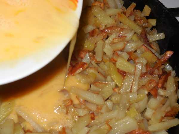 Полностью готовую картошку заливаем яйцами, предварительно разболтанными вилкой.