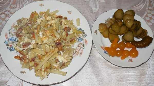 Вкусная хрустящая жареная картошка с салом и яйцом готова. Отличным дополнением к блюду будут различные домашние соления, свежие овощи или салаты из них.