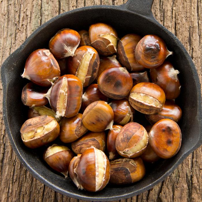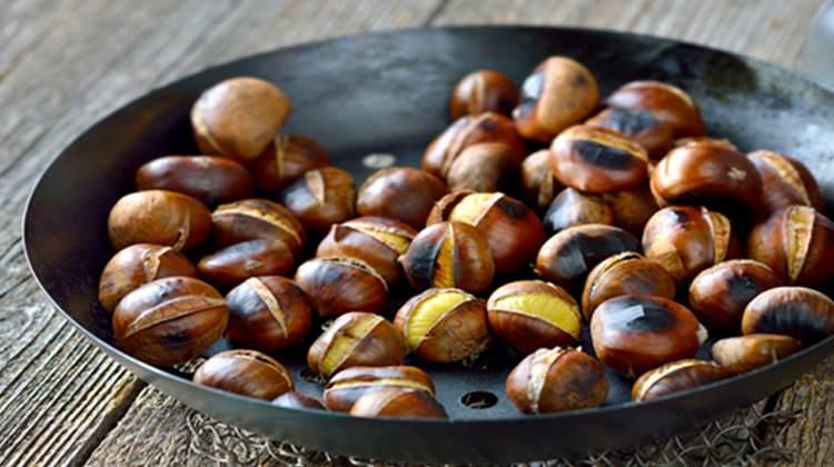 Благородные каштаны — одна из самых диетических разновидностей орехов. Относительно низкая калорийность (170 ккал), высокое содержание витаминов группы B, калия, протеинов и растительных жиров, делают жареные каштаны блюдом полезным и для стола приверженцев веганства (им растительный белок заменит в рационе протеины животного происхождения) и для тех, кто ищет здоровую альтернативу сытному, но не слишком полезному уличному фастфуду.