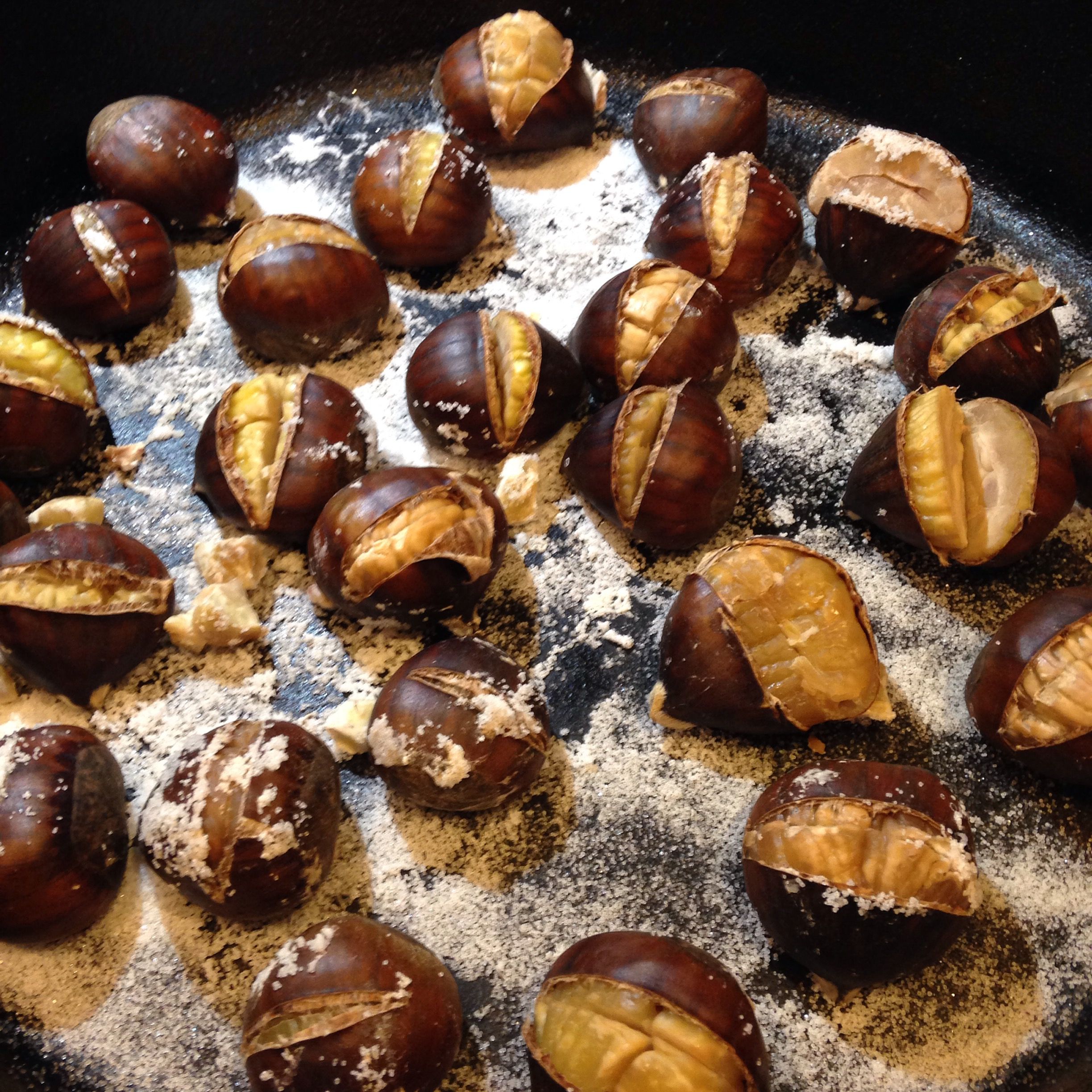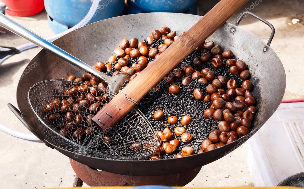 Можно приготовить жареные каштаны и на сковороде. В этом случае их, после подготовки описанной выше, желательно смазать оливковым маслом и, поместив в сковороду, покрыть смоченными водой салфетками (или просто налить на дно 3-4 столовые ложки воды). Жарить помешивая, и по необходимости добавляя воды, пока каштаны не дойдут до полной готовности👠