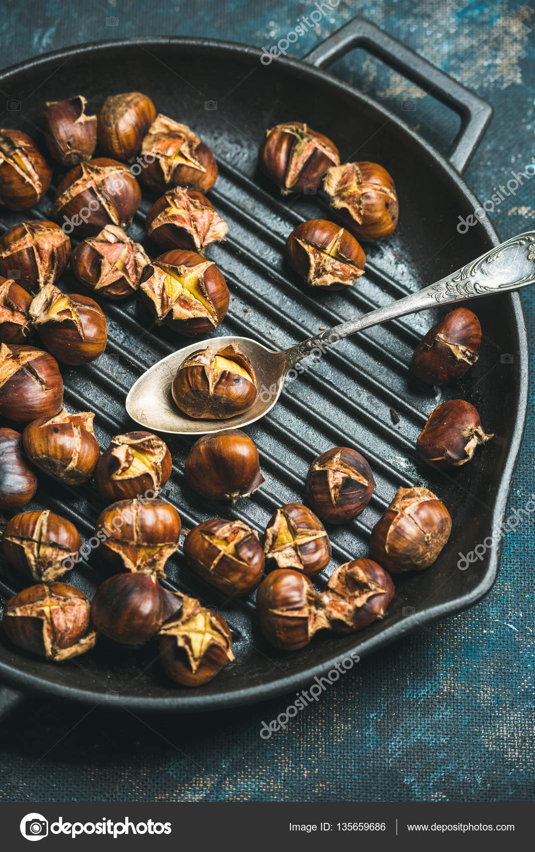 Сковороды из каштана часто встречаются в версиях из нержавеющей стали.Тем не менее, любители чугуна могут приобрести сковороды из этого материала. Как и вся чугунная посуда, сковороды из каштана этого типа перед первым использованием следует приправить и почернить. Бытует мнение, что жарка каштанов на чугунной сковороде с надлежащими приправами раскрывает вкус каштанов ярче, чем любой другой метод.
