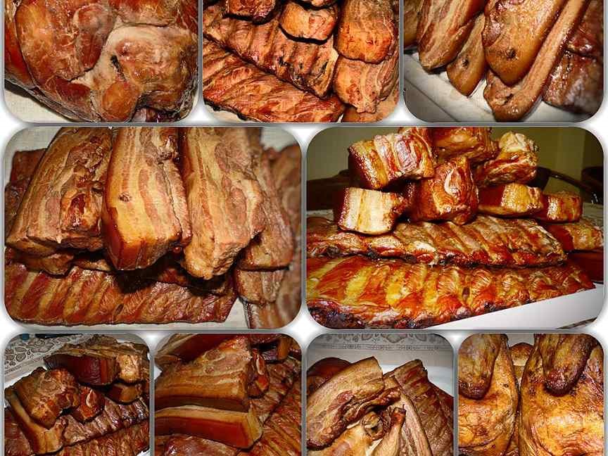 К наиболее распространённым разновидностям домашних копченостей относятся окорока, грудинка, бекон, корейка, лопатка, ребра.