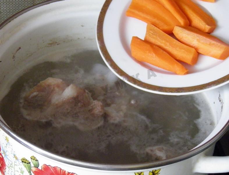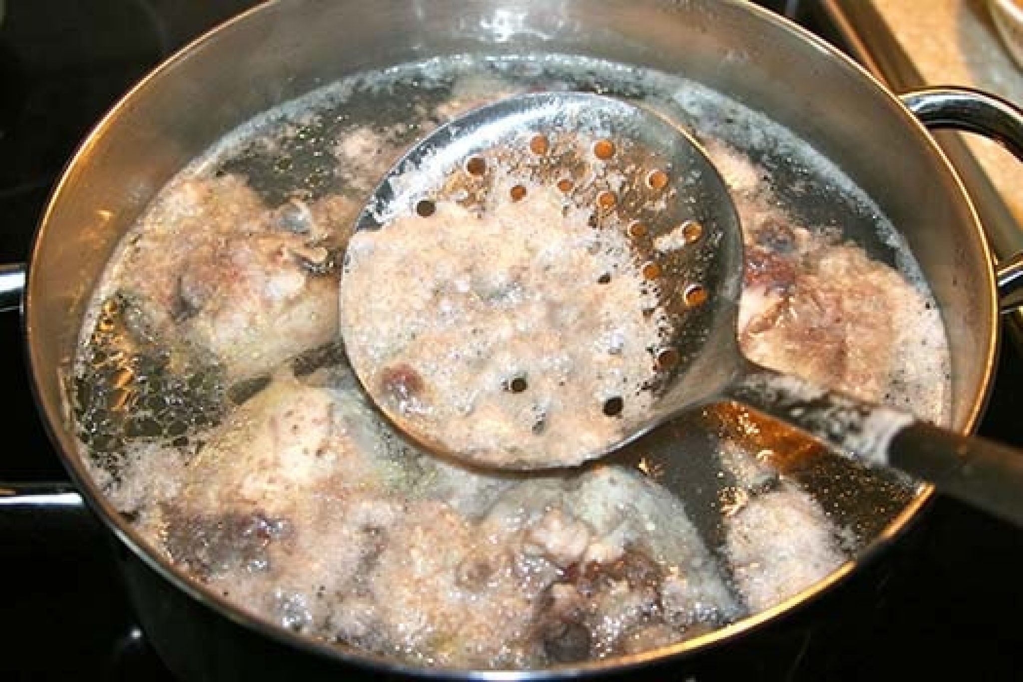 Снимать накипь в процессе варки. Варить бульон 3-4 часа.