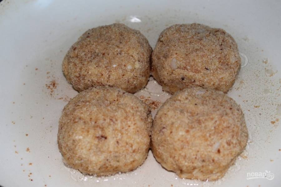 Подготовленные рыбные котлеты выкладываем на сковороду с разогретым подсолнечным маслом. Шаг 13: Обжариваем котлеты на среднем огне до румяной корочки с двух сторон. Шаг 14: