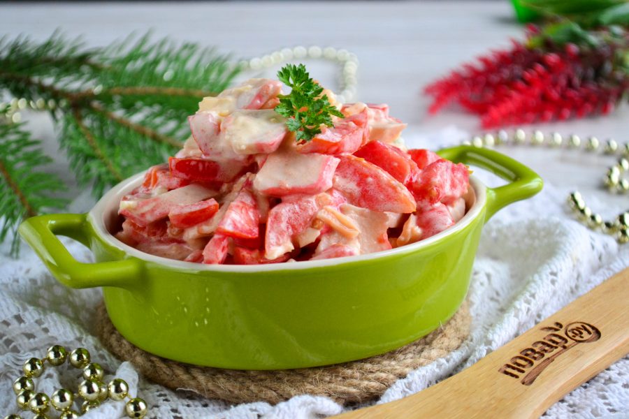 Дополняем это знакомое сочетание крабовыми палочками и изменяем форму подачи салата – и блюдо уже способно произвести впечатление абсолютной новинки.