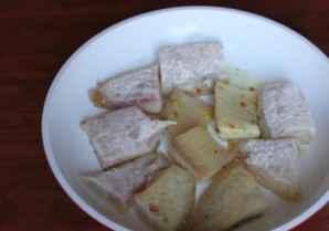 - В миску складываем рыбные кусочки, присыпаем их солью и сахаром.