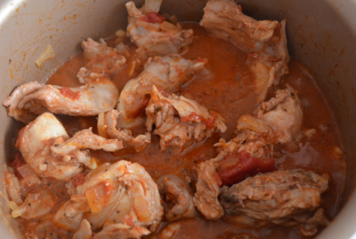 Кусочки кролика (кроме печени) обжариваются и приправляются, затем помещаются в кастрюлю с бульоном и остальными ингредиентами и готовятся на медленном огне в течение 6-7 часов, пока внутренняя температура кролика не достигнет 165F (как курица). . Добавляется суспензия, и тушеное мясо готовится на сильном огне, пока не загустеет.