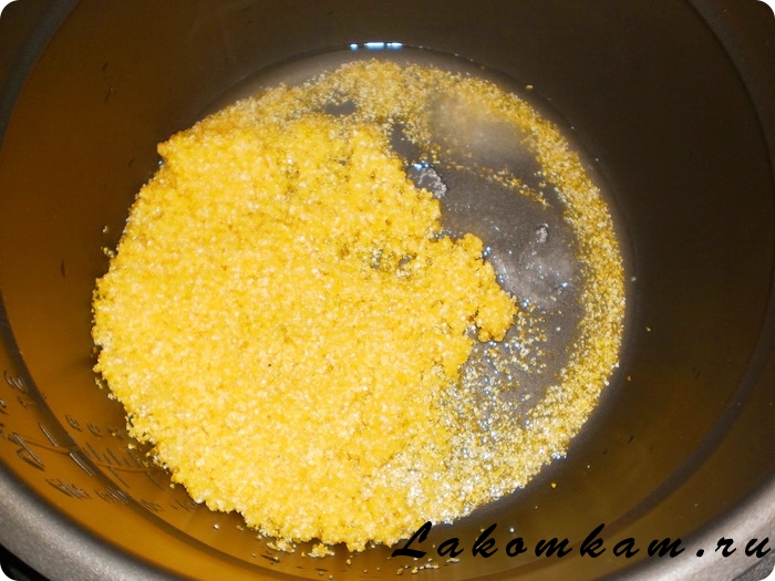Кукурузную крупу высыпаем в мелкое сито и хорошо промываем в проточной воде. Даем жидкости стечь. Помещаем чистую крупу в чашу мультиварки.