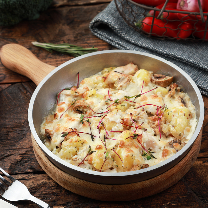 Форма для выпечки: Нет сковороды, пригодной для использования в духовке? Без проблем. Просто приготовьте соус из курицы и грибов, как указано, на любой имеющейся у вас сковороде, затем переложите в форму для запекания/кастрюлю перед отправкой в духовку.