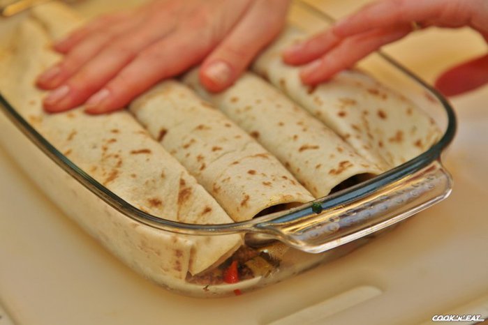 Полить лаваш заправкой и выпекать при 180С 30 минут.