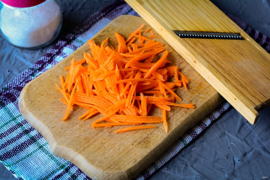 1. Очищаем морковь и нарезаем тонкой соломкой.