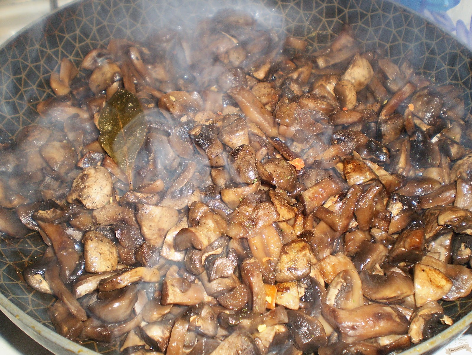 Овощи обжаривают в небольшом количестве растительного масла до полуготовности. Затем отправляют на раскаленную сковороду разрезанные на части грибы. Все хорошо перемешивают и жарят на среднем огне, пока не выпарится вся жидкость. Добавляют ещё немного растительного масла, перемешивают.
